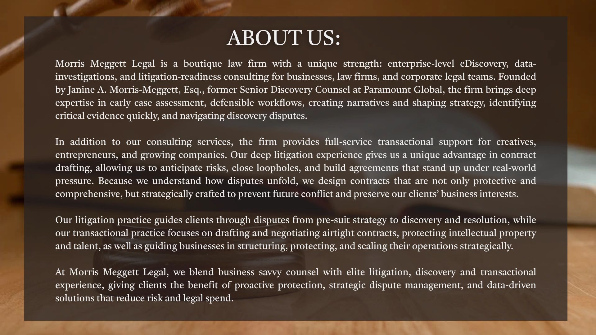 Morris Meggett Legal is a business law firm dedicated to supporting small and medium-sized businesses. We specialize in business formation, contract drafting and review, intellectual property protection, employment law, and dispute resolution.